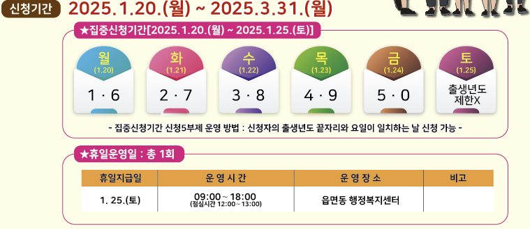 ※ 설 전 지급을 위해 1월 20일부터 25일까지 집중 신청 기간을 운영하며, 출생년도 끝자리에 따른 5부제를 시행합니다. 평일 방문이 어려운 시민을 위해 1월 25일(토요일)에도 행정복지센터를 운영합니다.